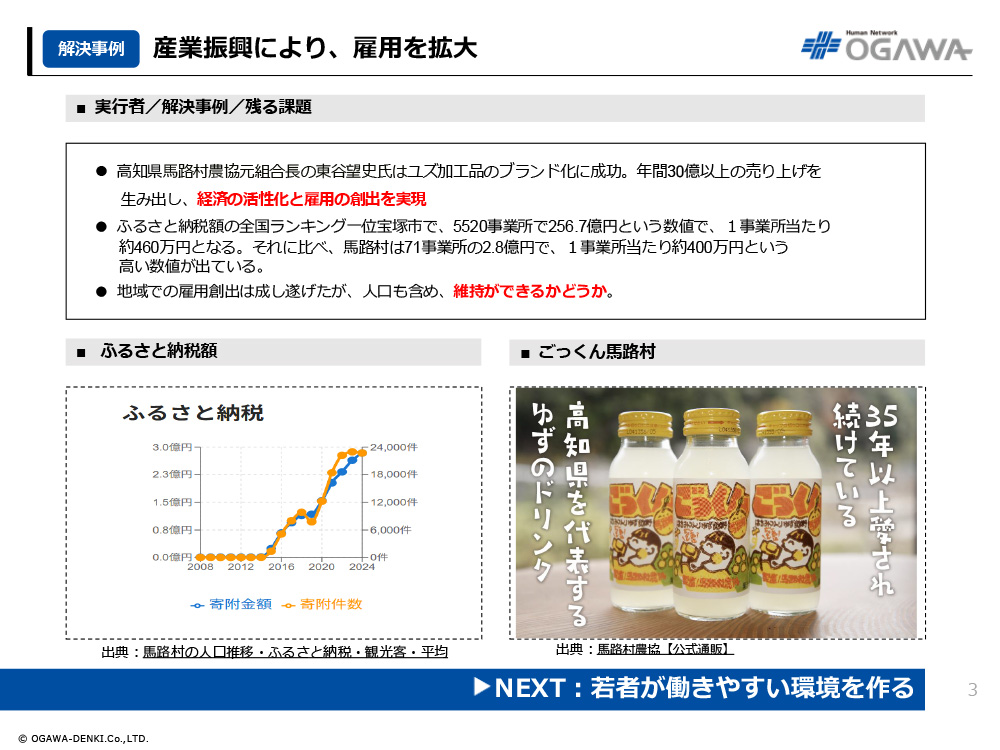 - 高知県馬路村農協元組合長の東谷望史氏はユズ加工品のブランド化に成功。年間30億以上の売り上げを生み出し、経済の活性化と雇用の創出を実現