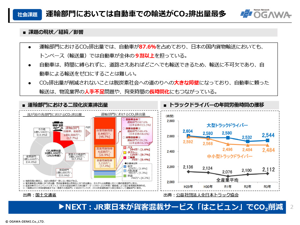 - CO₂排出量が削減されないことは脱炭素社会への道のりへの大きな障壁になっており、自動車に頼った輸送は、物流業界の人手不足問題や、拘束時間の長時間化にもつながっている。